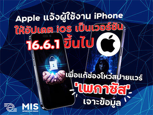 MIS News (ฉบับที่ 86) Apple แจ้งผู้ใช้งาน iPhone ให้อัปเดต iOS เป็นเวอร์ชัน 16.6.1 ขึ้นไป เพื่อแก้ช่องโหว่สปายแวร์ ‘เพกาซัส’ เจาะข้อมูล