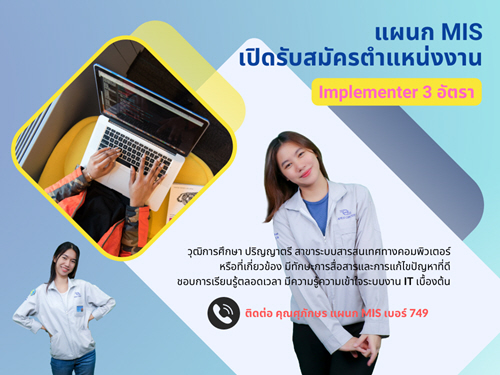 แผนก MIS เปิดรับสมัครตำแหน่งงาน Implementer 3 อัตรา