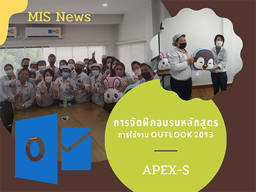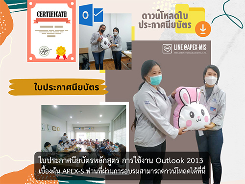 ใบประกาศนียบัตรหลักสูตร การใช้งาน Outlook 2013 เบื้องต้น APEX-S ท่านที่ผ่านการอบรมสามารถดาวน์โหลดได้ที่นี่