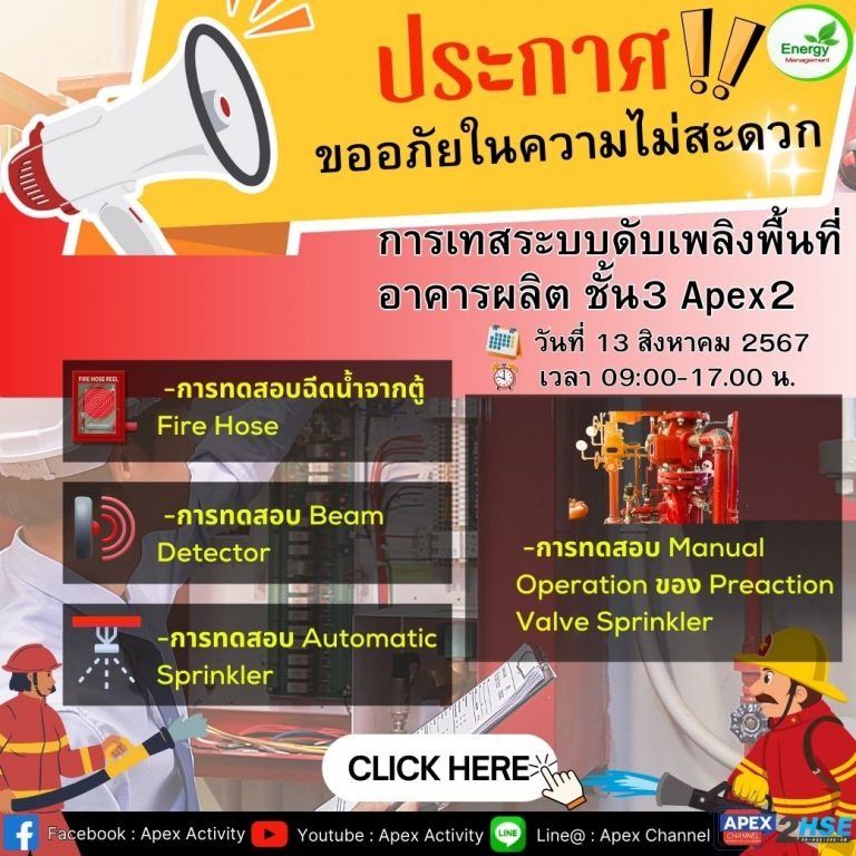 ประกาศ “การเทสระบบดับเพลิงอาคารผลิตชั้น 3 Apex2″วันอังคารที่ 13/08/24 เวลา 09:00-17.00 น.
