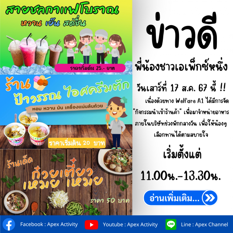 ข่าวดี…พี่น้องชาวเอเพ็กซ์หนึ่ง วันเสาร์ที่ 17 สิงหาคม 2567 “กิจกรรมนำเข้าร้านค้า” | WF Apex 1