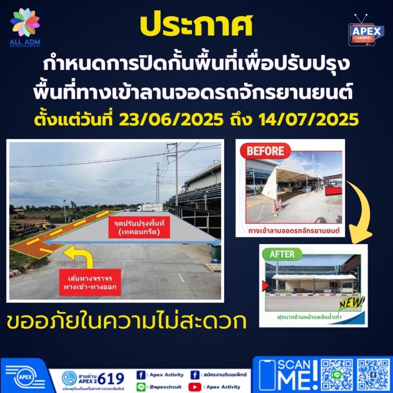 ประกาศ ! ปิดกั้นพื้นที่เพื่อปรับปรุงพื้นที่ทางเข้าลานจอดรถจักรยานยนต์