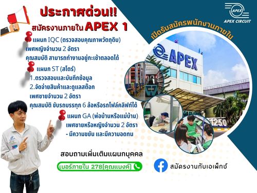 📢มาแล้วจ้า อย่าปล่อยให้โอกาสหลุดลอย😁👉วันนี้ทางแผนก IQC , ST และ GA เปิดรับสมัครพนักงานภายใน ประจำพื้นที่ Apex 1