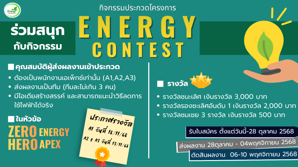 จึงขอเชิญเพื่อนๆชาว APEX สมัครเข้าร่วมประกวดโครงการประหยัดพลังงานไฟฟ้า