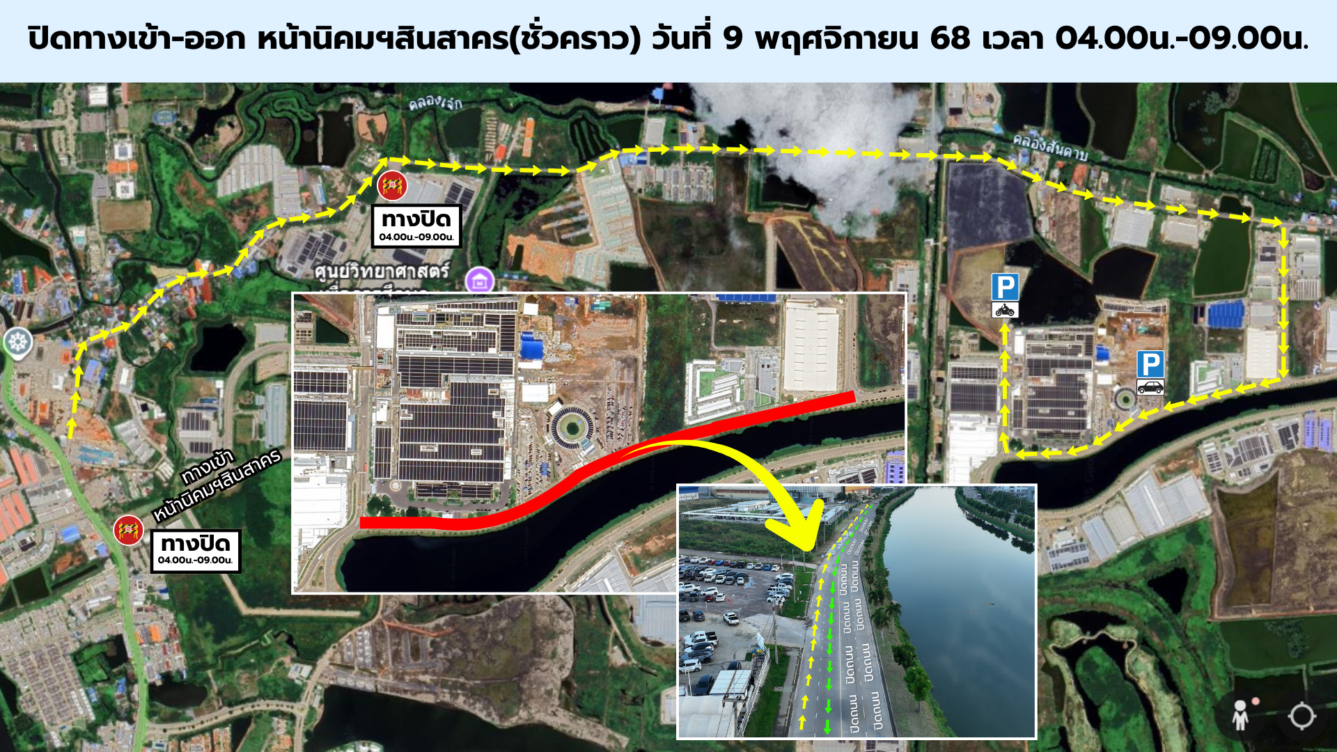 ทั้งนี้ บริเวณถนนรอบสระน้ำจะมีการปิดช่องทางเดินรถ ดังรูปด้านบน ขอให้พนักงานทุกท่านเดินทางด้วยความระมัดระวัง ส่วนของพนักงานที่เดินทางด้วยรถบัสจะจอดรับภายในบริษัทเหมือนเดิม ส่วนพนักงานที่มีญาติมารับขอให้งดจอดรถบริเวณริมสระน้ำ