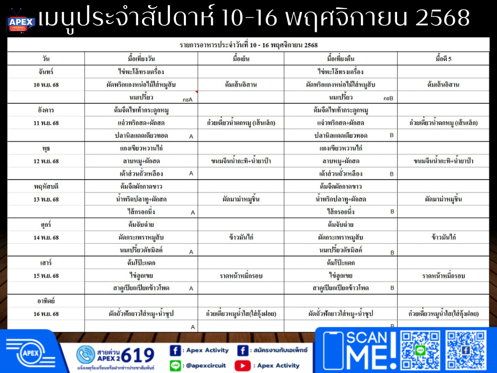 เมนูอาหารประจำสัปดาห์วันที่ 10-16 พฤศจิกายน 2568 Company News 10 พ.ย. 2025 share tweet share เมนูอาหารประจำสัปดาห์วันที่ 10-16 พฤศจิกายน 2568 โดยได้มีการสำรวจความต้องการจากทีม WF และคณะกรรมการที่มีส่วนเกี่ยวข้องและได้อนุมัติโดย ตัวแทนคณะกรรมการสวัสดิการ📧 หากท่านใดมีข้อเสนอแนะ สอบถามรายละเอียดเพิ่มเติมได้ที่ GA-G โทร 719 ขอบคุณครับ ขอความร่วมมือพนักงานทุกท่าน “ห้ามจองที่นั่งโรงอาหาร” Facebook Youtube Line