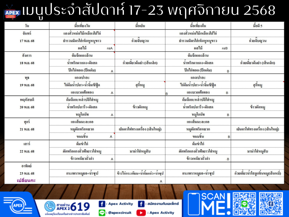 เมนูอาหารประจำสัปดาห์วันที่ 17-23 พฤศจิกายน 2568