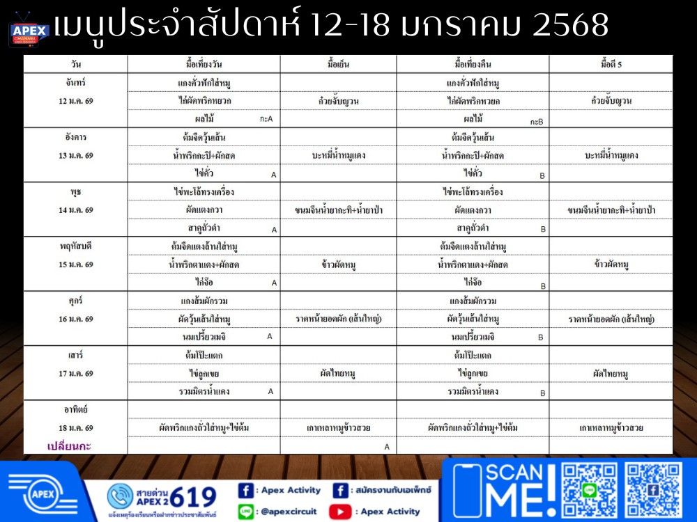 เมนูอาหารประจำสัปดาห์วันที่ 12-18 มกราคม 2569 Company News 13 ม.ค. 2026 share tweet share เมนูอาหารประจำสัปดาห์วันที่ 12-18 มกราคม 2569โดยได้มีการสำรวจความต้องการจากทีม WF และคณะกรรมการที่มีส่วนเกี่ยวข้องและได้อนุมัติโดย ตัวแทนคณะกรรมการสวัสดิการ📧 หากท่านใดมีข้อเสนอแนะ สอบถามรายละเอียดเพิ่มเติมได้ที่ GA-G โทร 719 ขอบคุณครับ ขอความร่วมมือพนักงานทุกท่าน “ห้ามจองที่นั่ง” พื้นที่โรงอาหาร