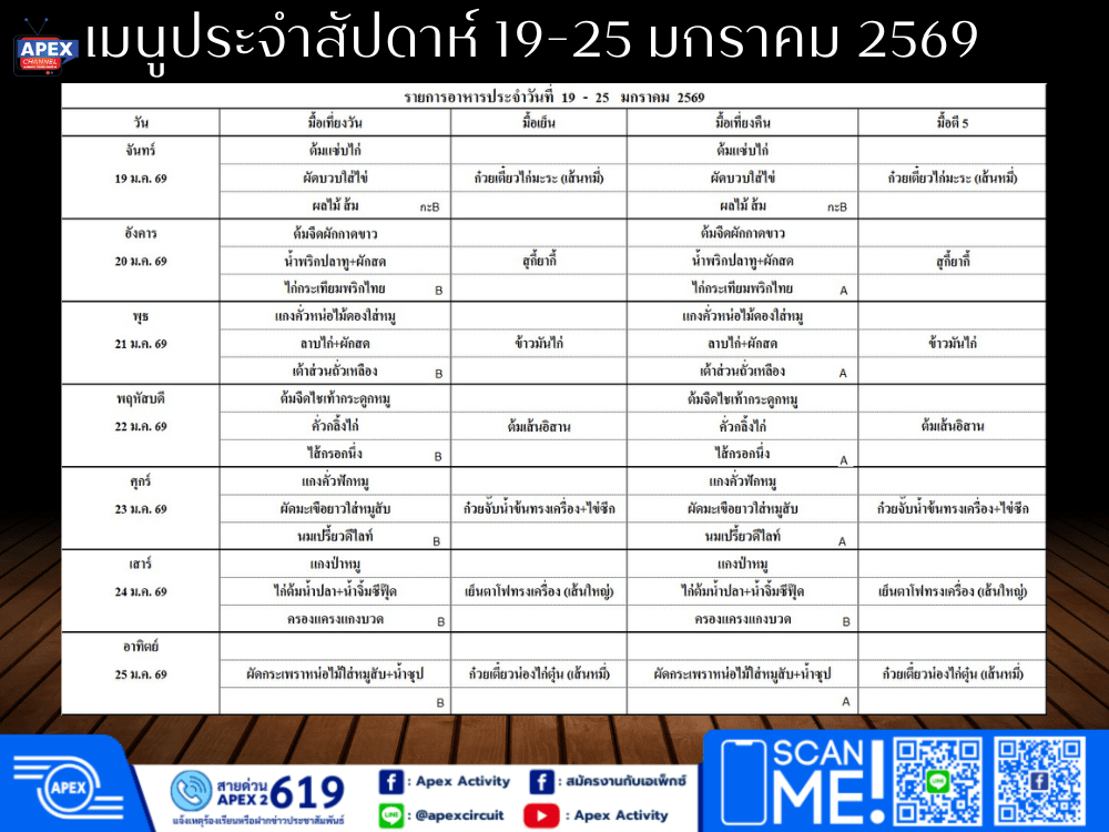 All ADM News (ฉบับที่ 4/2569) เมนูอาหารประจำสัปดาห์วันที่ 19-25 มกราคม 2569 Company News 20 ม.ค. 2026 share tweet share เมนูอาหารประจำสัปดาห์วันที่ 19-25 มกราคม 2569 โดยได้มีการสำรวจความต้องการจากทีม WF และคณะกรรมการที่มีส่วนเกี่ยวข้องและได้อนุมัติโดย ตัวแทนคณะกรรมการสวัสดิการ📧 หากท่านใดมีข้อเสนอแนะ สอบถามรายละเอียดเพิ่มเติมได้ที่ GA-G โทร 719 ขอบคุณครับ ขอความร่วมมือพนักงานทุกท่าน “ห้ามจองที่นั่ง” พื้นที่โรงอาหาร Facebook Youtube Line