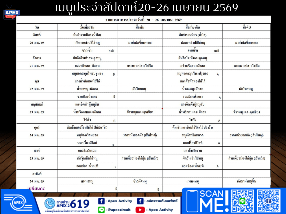 All ADM News (ฉบับที่ 45/2569) เมนูอาหารประจำสัปดาห์วันที่ 20-26 เมษายน 2569 Company News 20 เม.ย. 2026 share tweet share เมนูอาหารประจำสัปดาห์วันที่ 20-26 เมษายน 2569 โดยได้มีการสำรวจความต้องการจากคณะกรรมการที่มีส่วนเกี่ยวข้องและได้อนุมัติโดย ตัวแทนคณะกรรมการสวัสดิการ ขอความร่วมมือพนักงานทุกท่าน “ห้ามจองที่นั่ง” พื้นที่โรงอาหารหากท่านใดมีข้อเสนอแนะ สอบถามรายละเอียดเพิ่มเติมได้ที่ GA-G โทร 719 ขอบคุณครับ Facebook Youtube Line